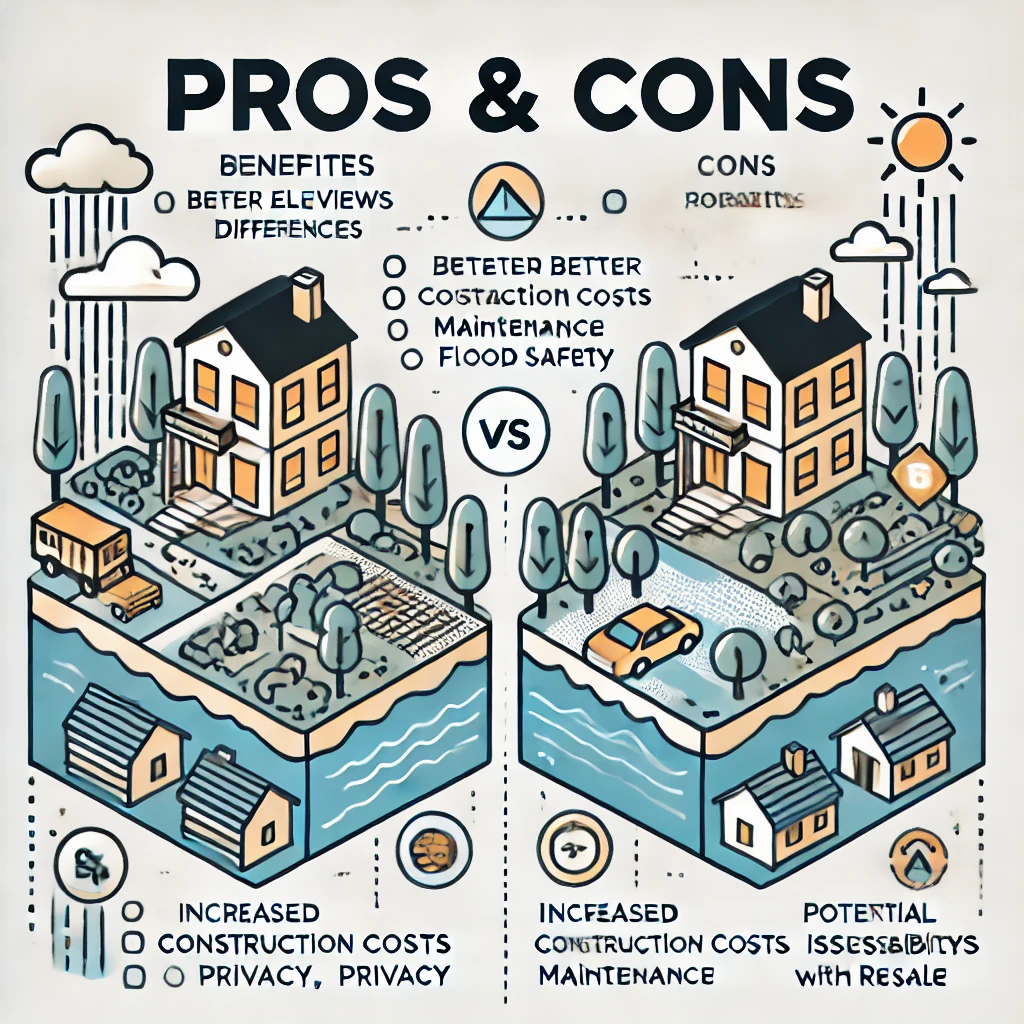 - 再販売時のデメリット 高低差がある物件は、再販売時に買い手が見つかりにくいことがあります。眺望やプライバシーといった魅力をアピールポイントにする一方で、生活の利便性や建築コストの増加がネックになる場合があります。